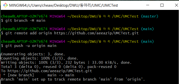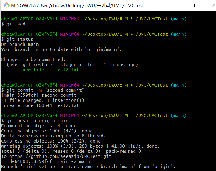 → origin에 main 브랜치로 변경사항 푸시 (UMC/UMCTest/test2.txt 업로드)