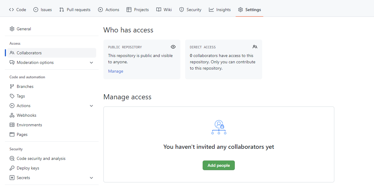 🗨️ A는 Github에 repository를 생성 + Collaborators에서 Add people을 선택