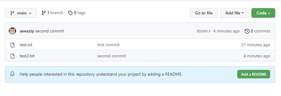 → main 브랜치에 test.txt / test2.txt 파일 추가된 것을 확인할 수 있다.