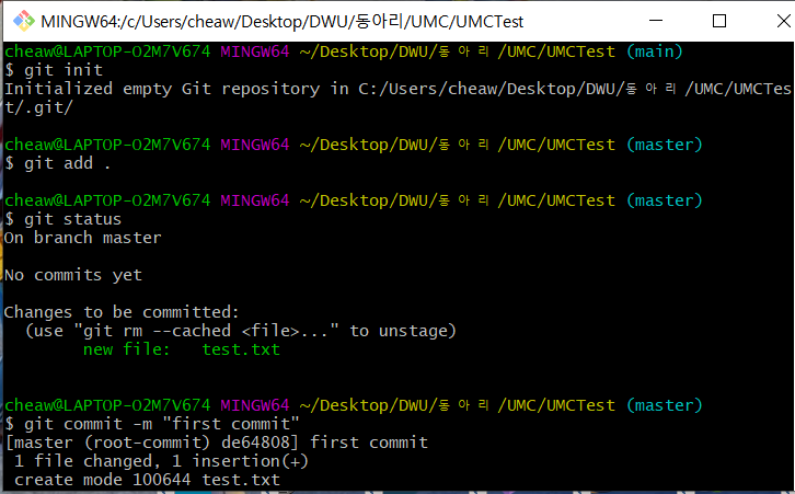 → origin에 main 브랜치로 변경사항 푸시 (UMC/UMCTest/test.txt 업로드)
