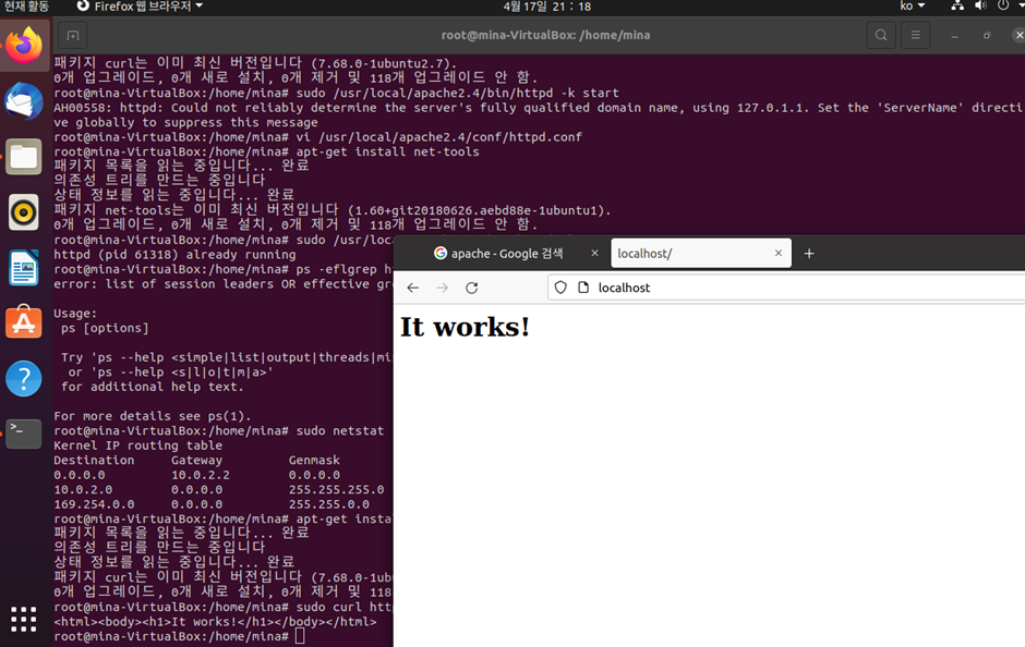 | $ sudo /usr/local/apache2.4/bin/httpd -k start → 웹서버 데몬 httpd의 실행 경로를 적어준다. $ ps -ef | grep httpd | grep -v grep → ps -ef | grep httpd = 이름에 httpd가 포함되는 프로세스 목록을 모두 출력 $ sudo netstat -anp | grep httpd → netstat = 네트워크 상태 확인 명령어 (-a -o : 사용중인 포트 확인 가능) $ sudo curl http://127.0.0.1 →curl = HTML 정보를 출력 |