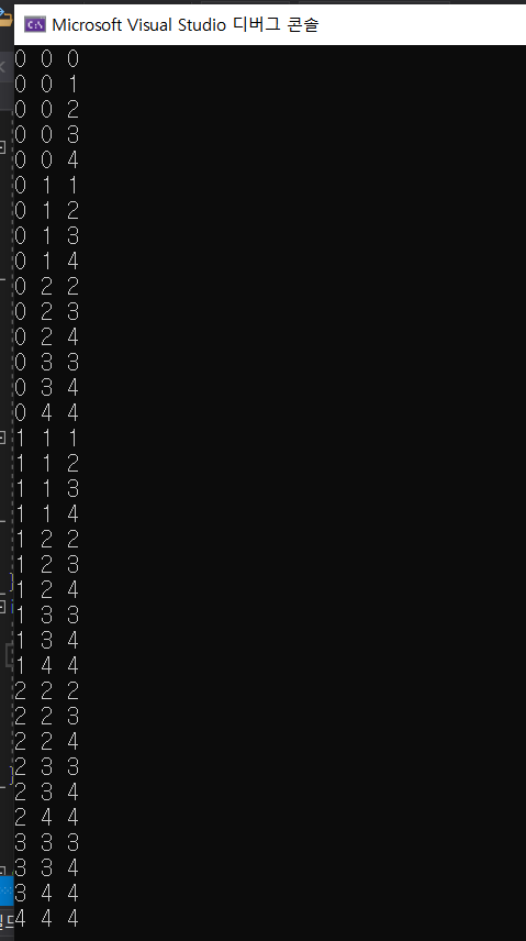- 5H3 = 35이므로 총 35가지 경우의 수를 만족하고 모든 경우의 수가 올바르게 출력된 걸 확인할 수 있다