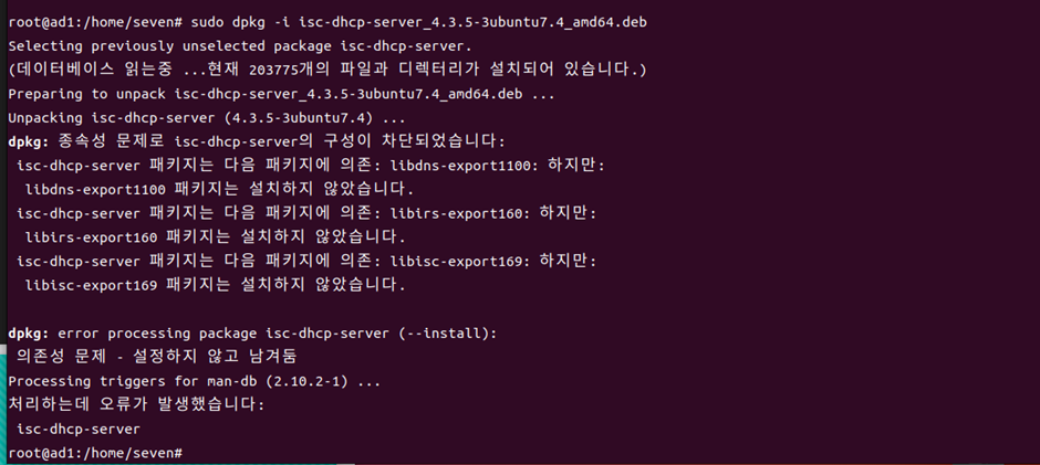 sudo dpkg -i isc-dhcp-server_4.3.5-3ubuntu7.4_amd64.deb 명령어를 사용한다.