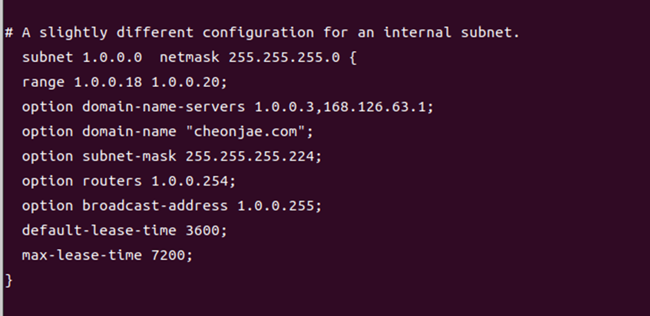 | default-lease-time | 임대요청 만료시간을 초단위로 지정 |