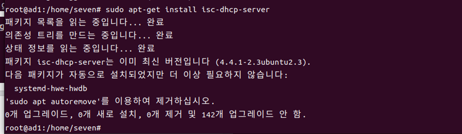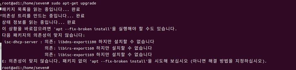–fix broken install 명령어로 의존성을 바로잡고, install isc-dhcp-server 명령어로 dhcp 패키지를 다시 다운받아 주었다.