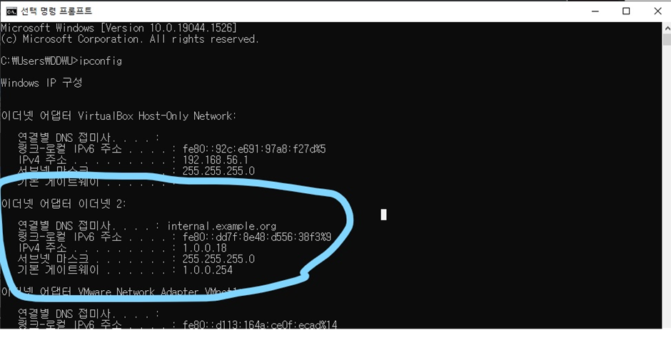 3. 연결한 Window 컴퓨터에서 ifconfig 명령어를 쳤을 때 이더넷 2에서