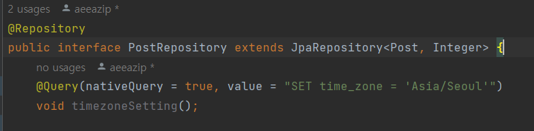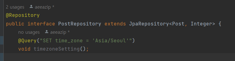 JDBC로 작성했던 코드를 JPA로 변경하고 있는데 timezone 설정이 필요해서 Repository에 직접 쿼리문을 작성해주었다.