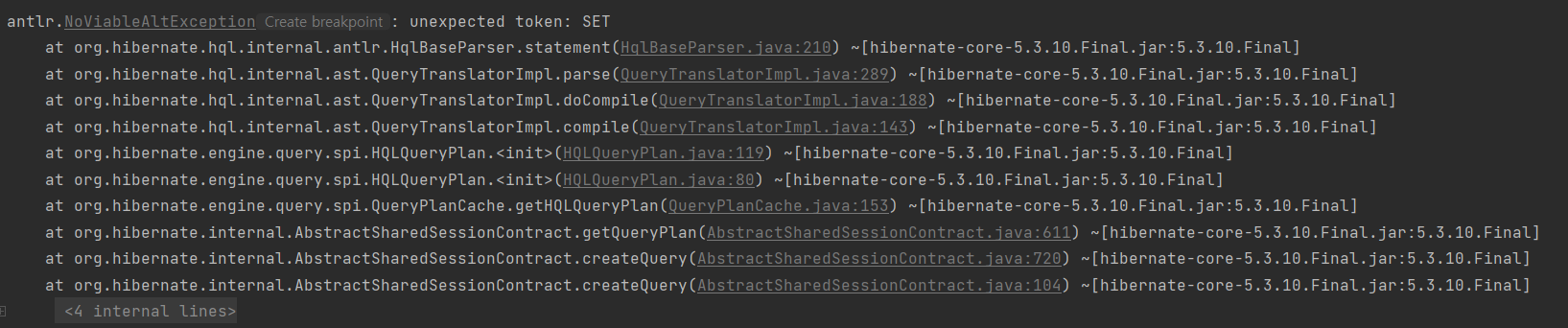 antlr.NoViableAltException: unexcepted token: SET 에러가 발생했다.