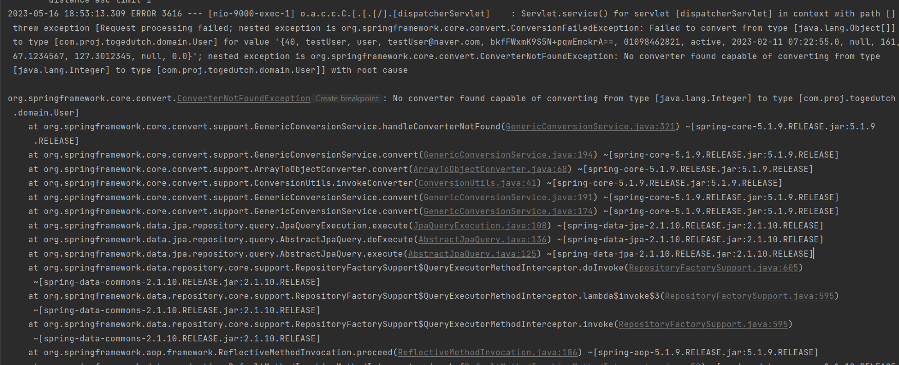 에러 메시지는 Integer 타입의 결과값을 User로 변환할 수 있는 converter를 찾지 못했다는 의미로