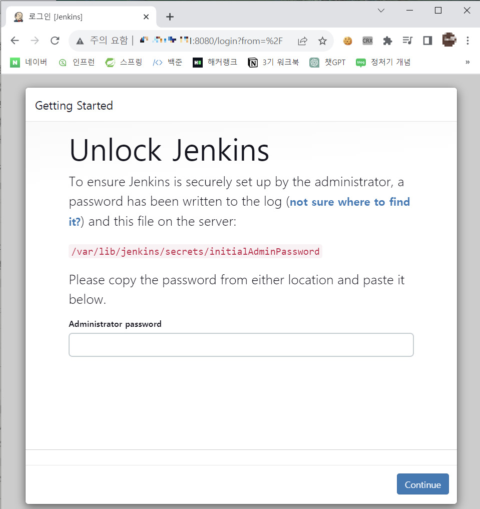 http://[도메인]:8080/ 접속해서 Jenkins 설정을 이어가야 한다.