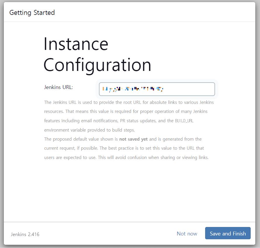 값을 모두 입력 후 Save and Continue를 선택하면 Jenkins 접속 URL을 설정해주어야 한다. 도메인을 구매했거나 8080 외에 다른 포트번호를 사용하고 싶다면 이때 설정해주면 된다! 나는 이전과 동일한 주소를 사용했다.
