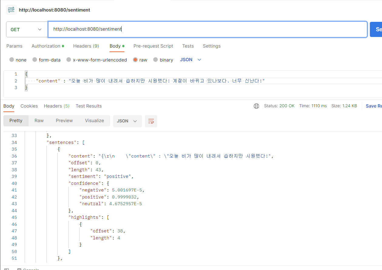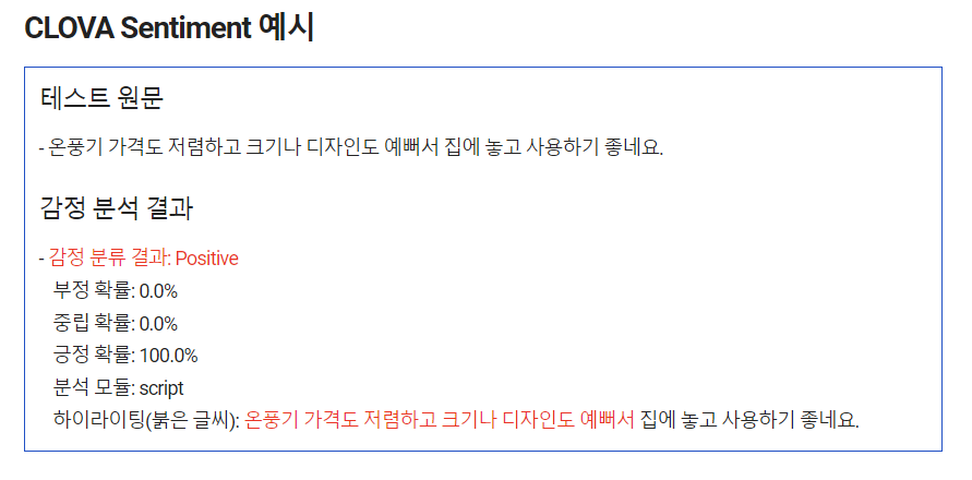 + 참고로 Sentiment 서비스는 한국어에 최적화된 감정 분석 기술 서비스로 예시는 다음과 같다.