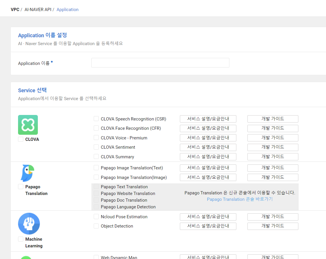 로그인 후 콘솔 창에 들어왔다면 Services > AI Naver API > AI NAVER API를 선택한다.