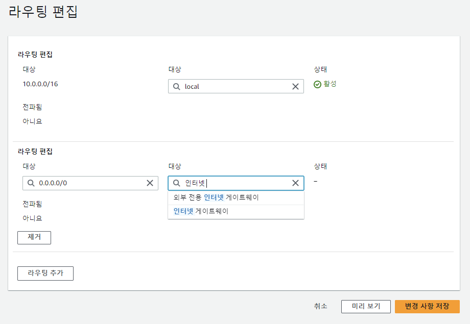 - 위에서 생성한 igw 선택 후 변경사항 저장 선택