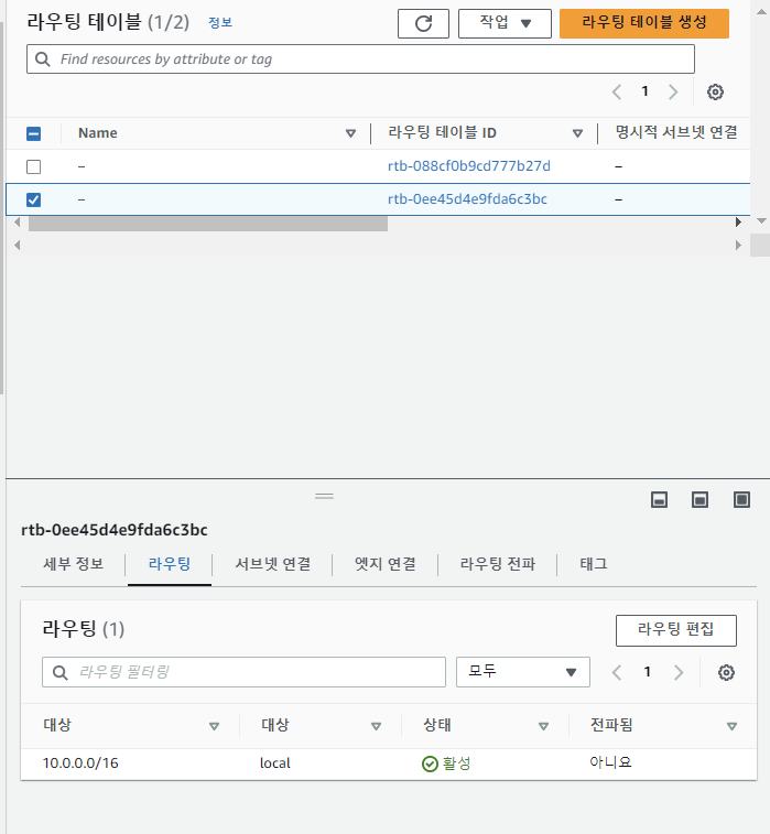 - VPC > 라우팅 테이블 선택