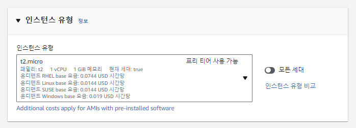 - t2.micro, t3.micro 등 micro 유형이 프리티어가 가능하므로 micro 선택