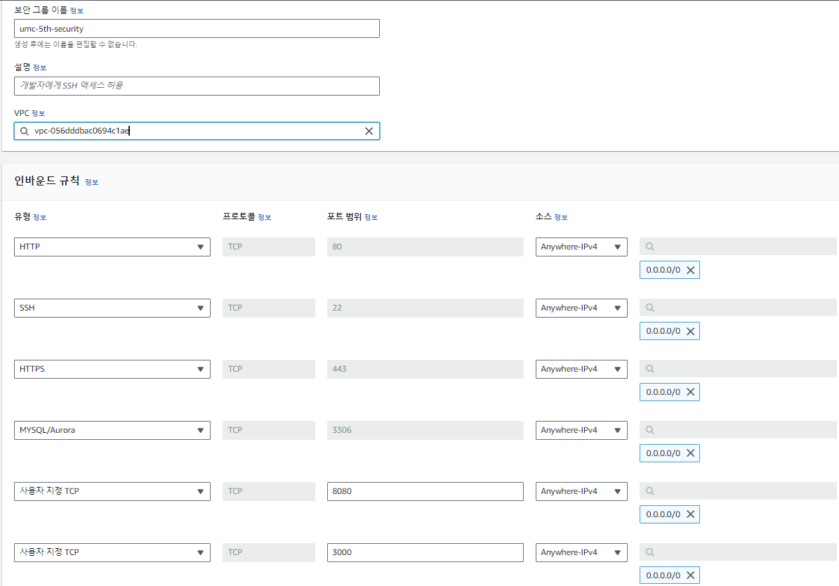 - 보안 그룹 생성을 클릭 후 인바운드 설정