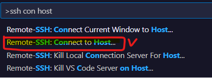 5. F1을 누른 후, Remote-SSH: Connect to Host 클릭 + 내가 설정한 호스트 이름을 선택