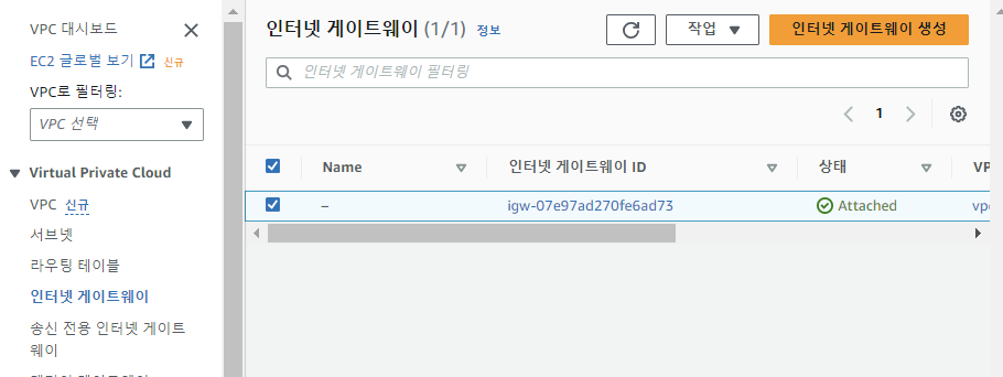 - 인터넷 게이트웨이 선택하면 위에서 생성한 인터넷 게이트웨이가 자동으로 뜸