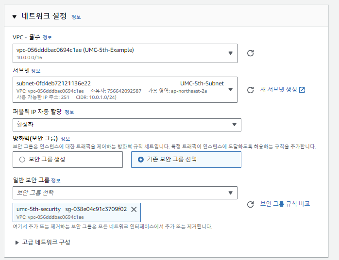 - 위에서 생성한 VPC와 서브넷으로 설정