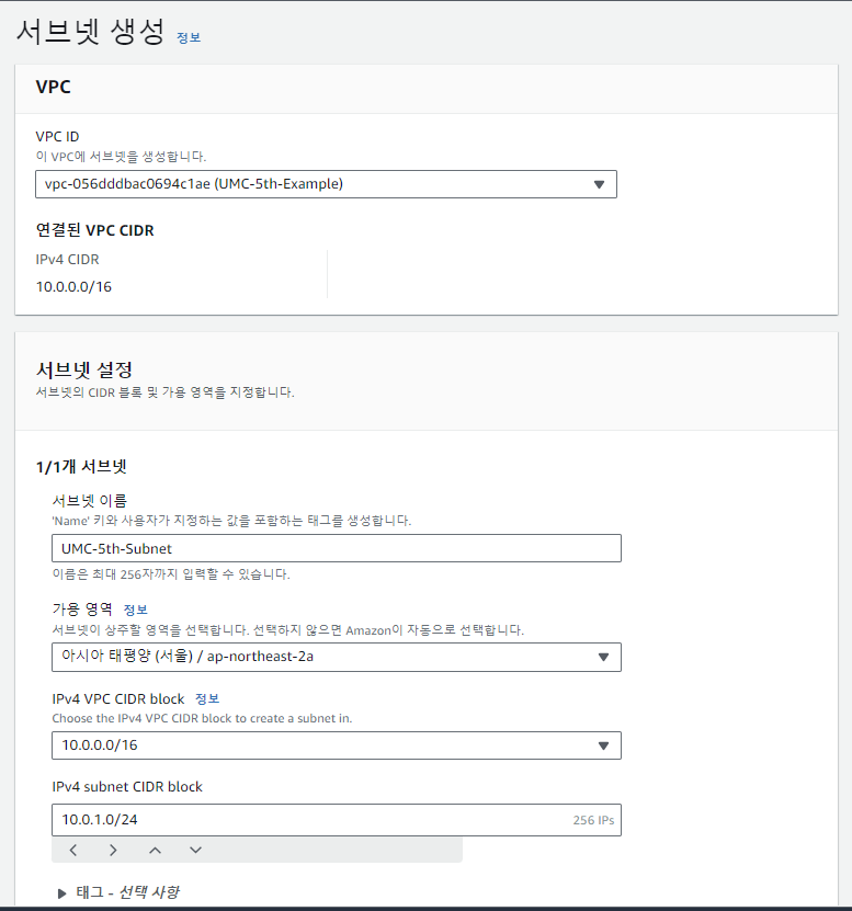 - IPv4 subnet CIDR block은 10.0.1.0/24 (서브넷을 이어 만들 때는 10.0.2.0/24, 10.0.3.0/24 …. )
