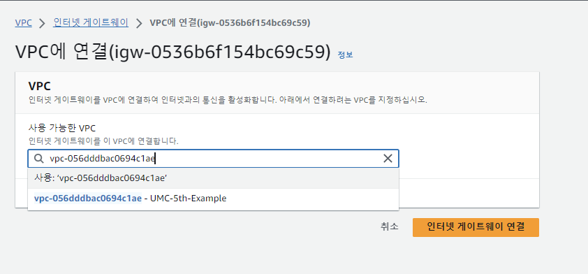 - 아까 만들었던 VPC에 연결