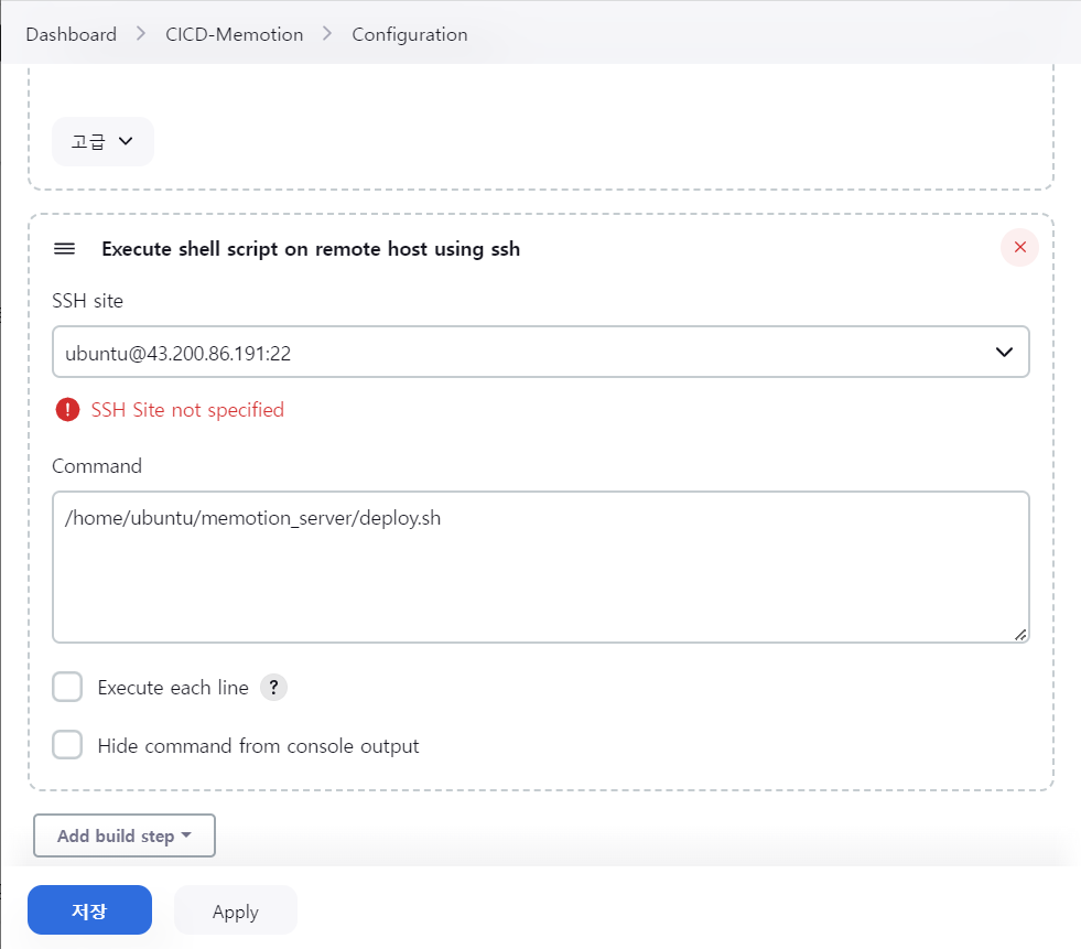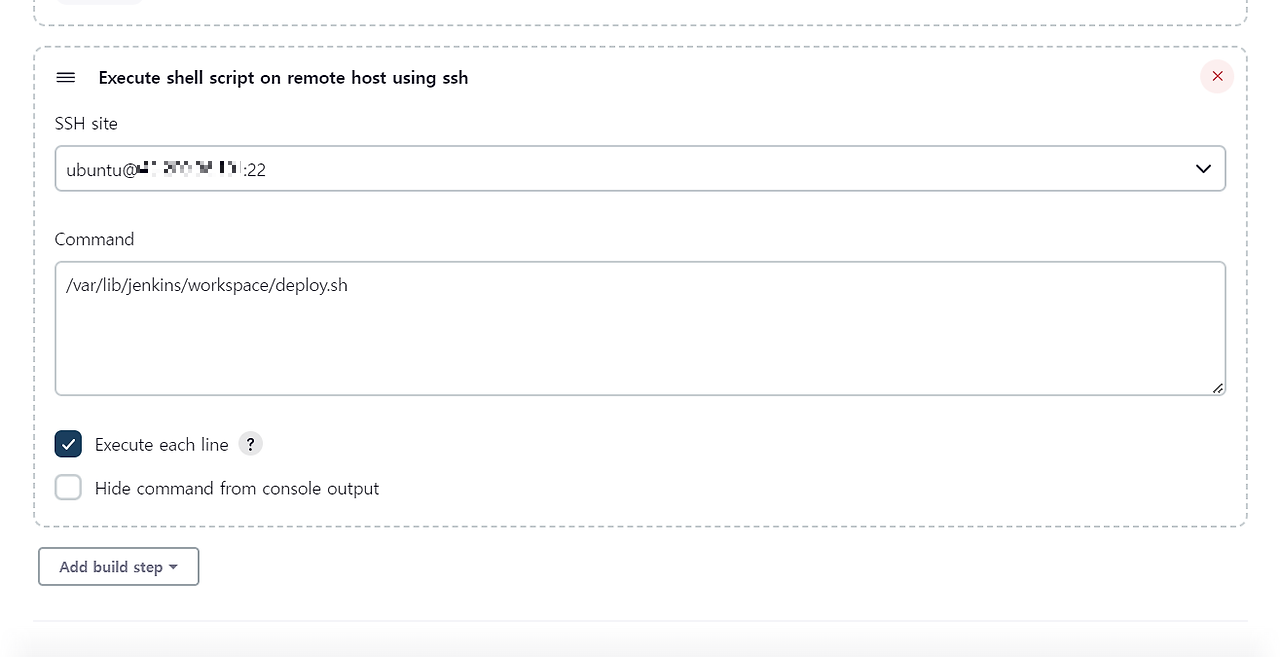 - Build > Add build step에서 Execute shell script on remote host using ssh 추가