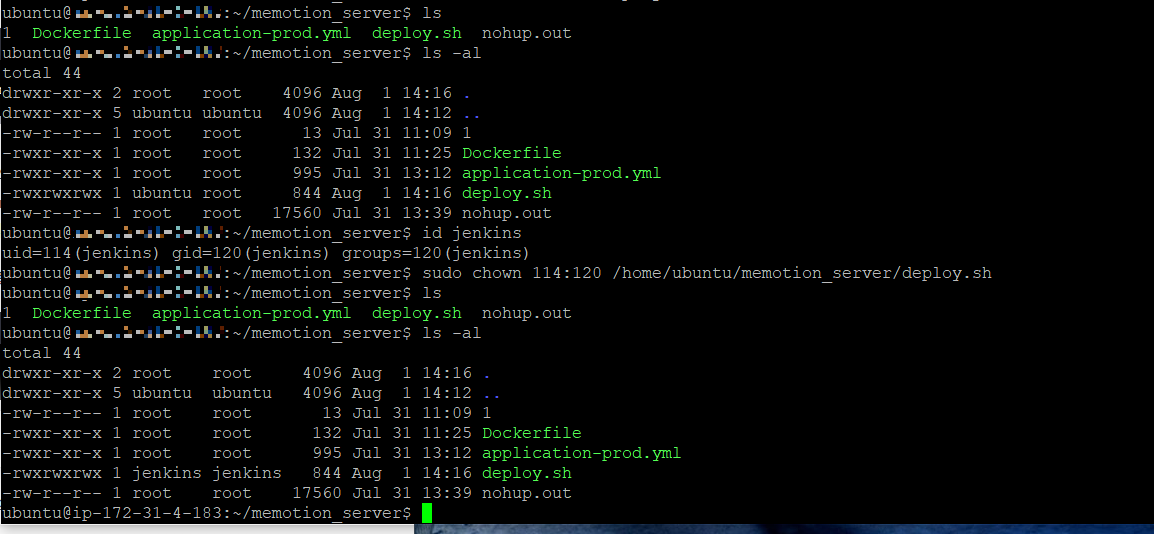 $ sudo chown jenkins-user:jenkins-group /home/ubuntu/memotion_server/deploy.sh