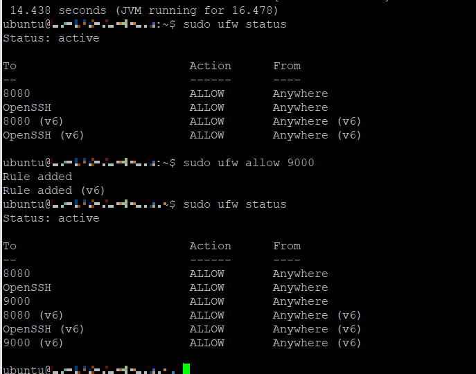 memotion 서버는 9000 포트를 사용하기 때문에 방화벽으로 80, 8080, 9000 등등의 포트를 열어주었다.