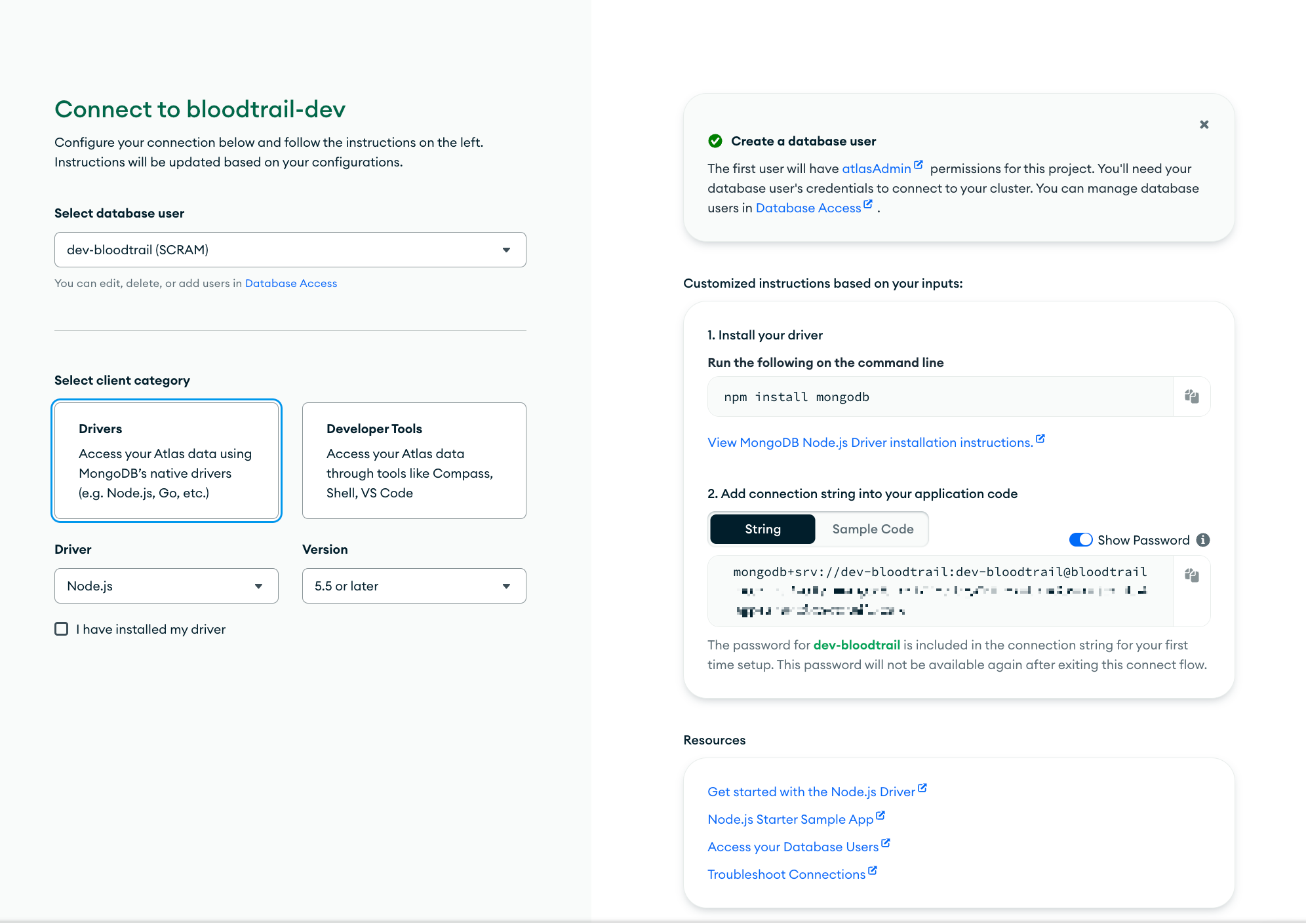 Node.js로 구축된 서버에서 MongoDB에 접근하기 위해서는 select client category를 Drivers로 선택한다.