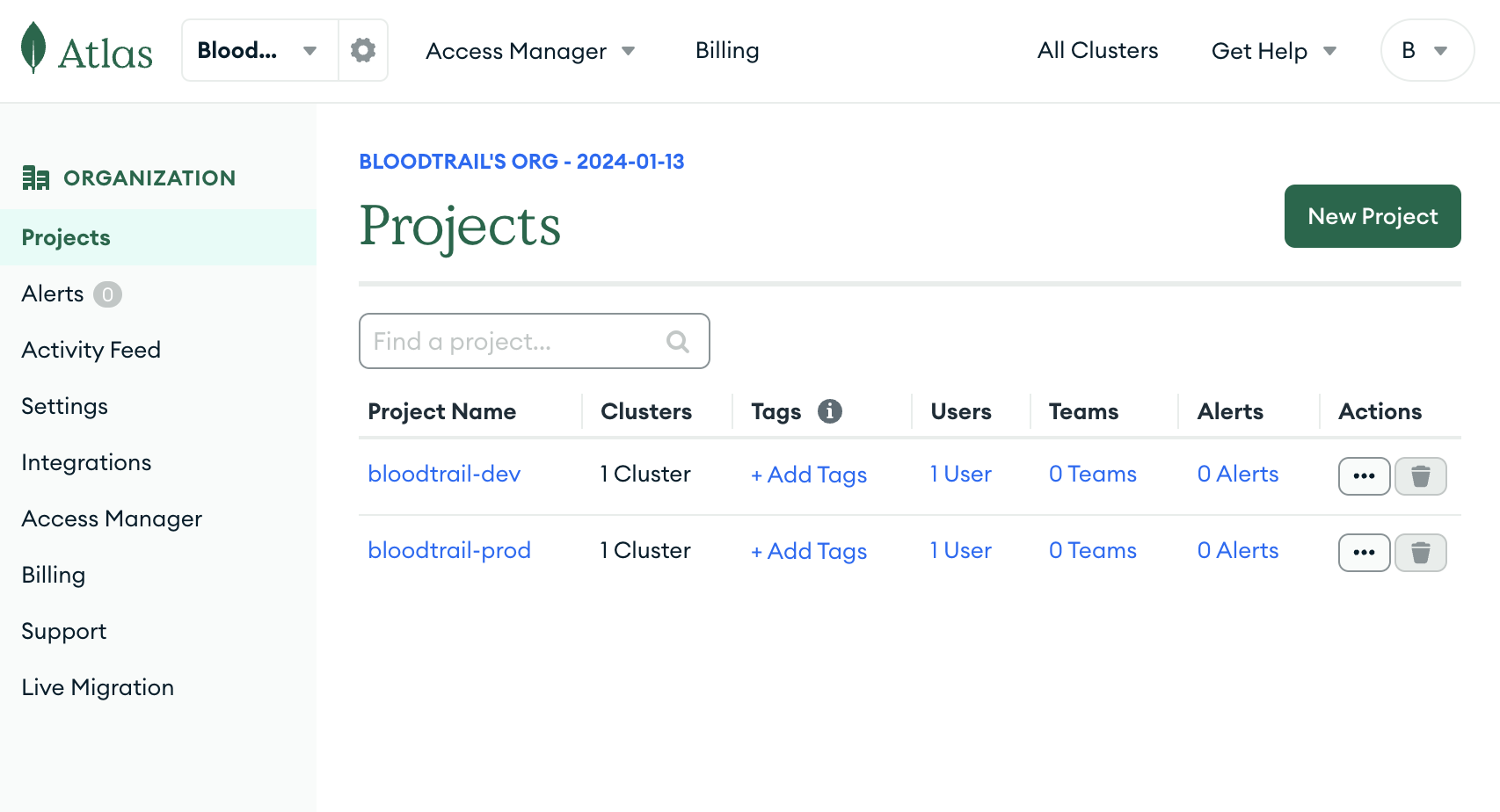 Github Organization 내부에 Repository를 생성하는 것처럼, New Project를 클릭하여 생성한 Organization 내부에 Project를 만들어준다.