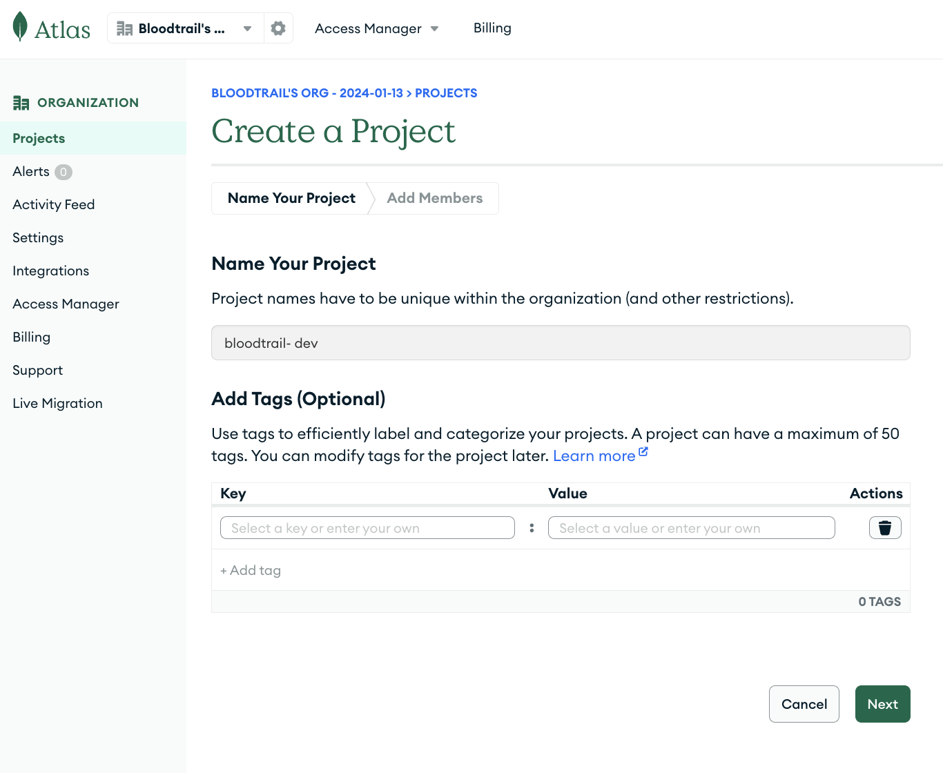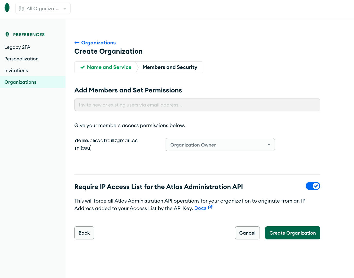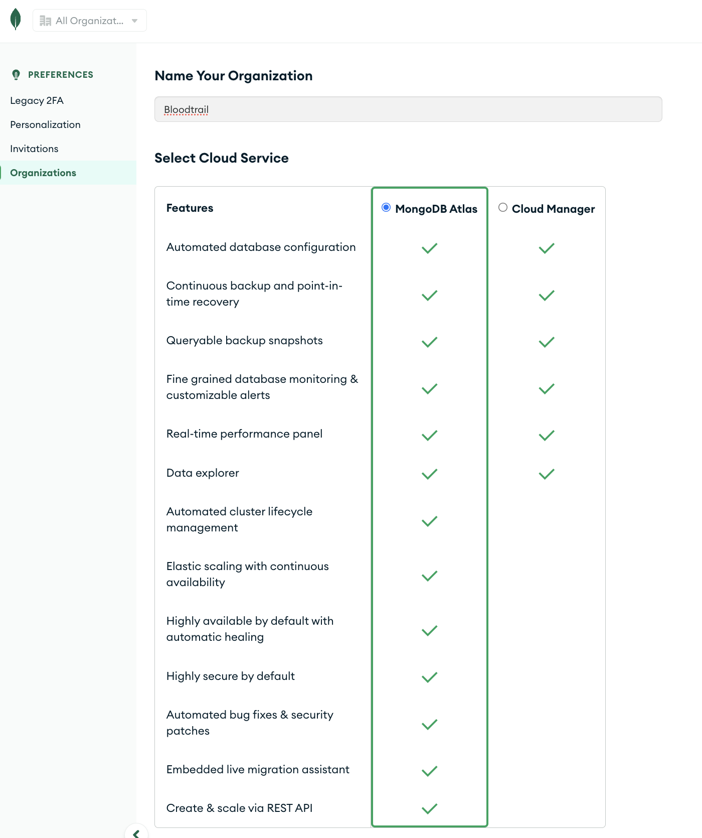 Organization 이름을 입력하고 MongoDB Atlas를 선택한다.