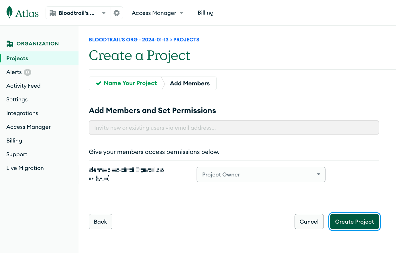 초대할 Member의 메일과 권한을 입력하고 Create Project를 눌러 새로운 Project를 생성한다.