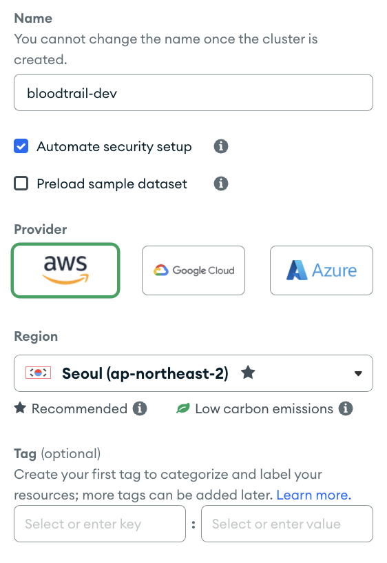 MongoDB Atlas는 클라우드 제공자를 AWS, Google Cloud, Azure 중 선택할 수 있는데