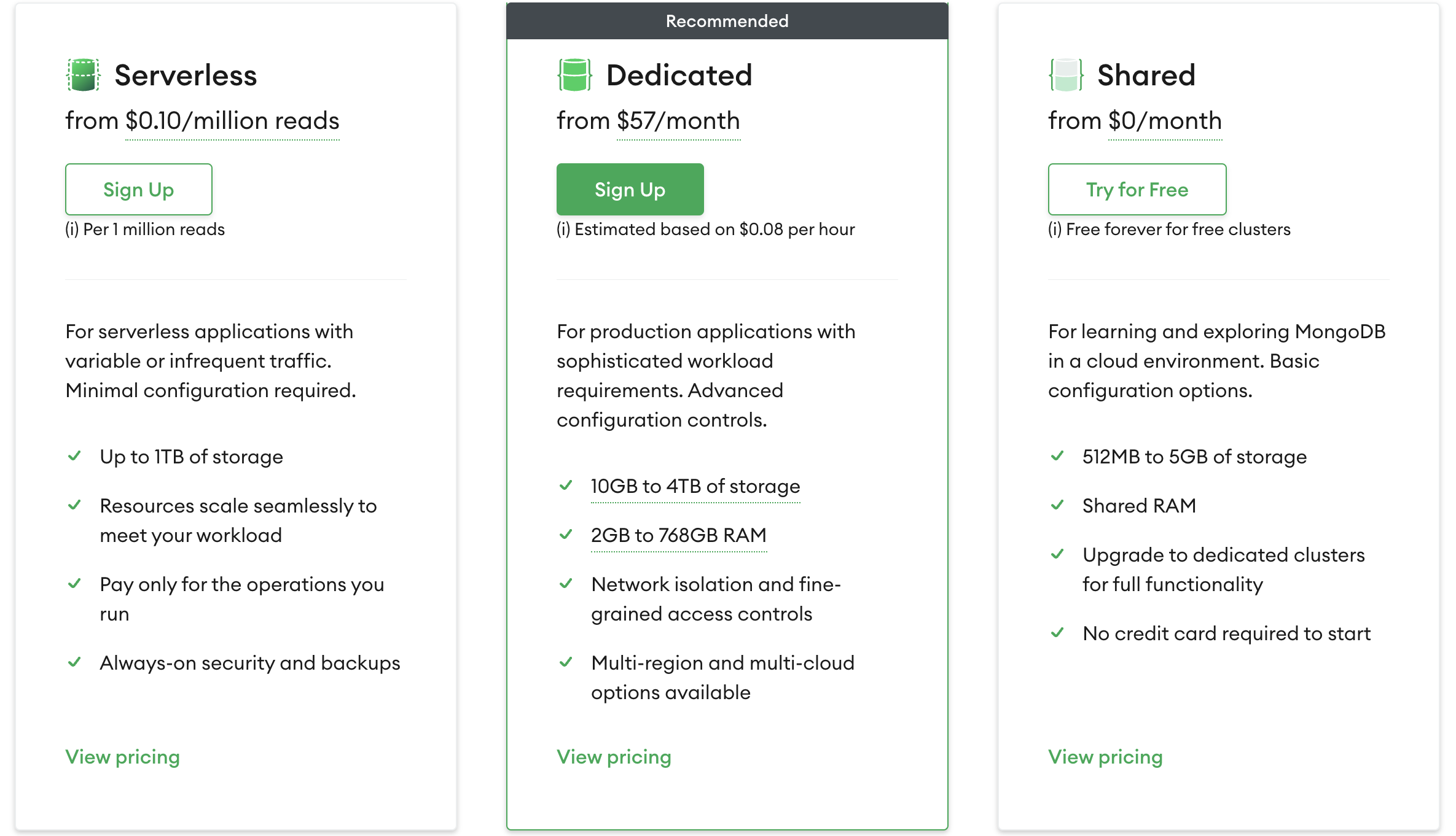 무료 버전은 Shared로 최대 5GB의 storage를 무료로 사용할 수 있다. 자세한 옵션은 사이트에서 참고하길 바란다.