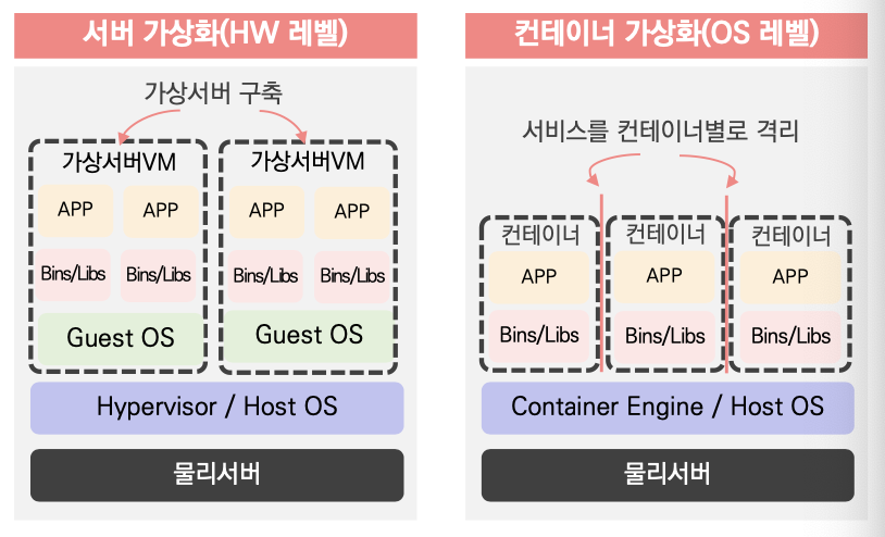 컨테이너 가상화는 OS 레벨에서 이뤄지며, 물리 서버 자원을 분할해 논리적인 컨테이너를 만들었다.