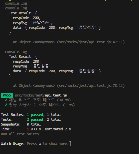 위의 명령어를 입력하면 작성한 테스트 api가 병렬적으로 실행되면서 결과를 리턴한다.