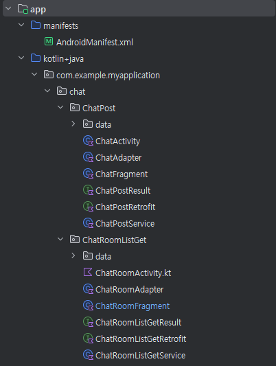 아래의 ChatPostRequest.kt, ChatPostResponse.kt, Chat.kt, ChatInfo.kt 4개의 파일은 모두 data 패키지에 속한 DTO 파일이다.